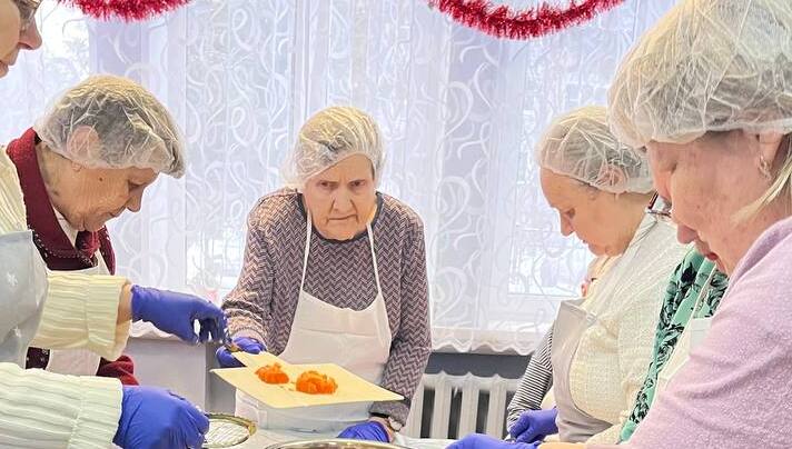 Волонтеры привезли продукты и совместно с жителями нашего дома-интерната приготовили салат "Оливье" и фаршированные блины, а еще на полдник был "Тыквенный манник", фрукты и сладости.