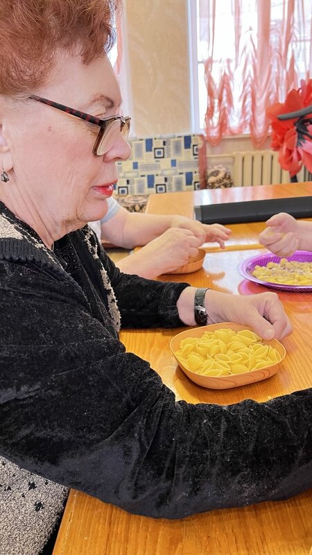 Под вечные хиты Джо Дассен жители неспешно беседовали и развивали мелкую моторику, тактильную чувствительность, улучшая межполушарное взаимодействие мозга и концентрацию внимания.